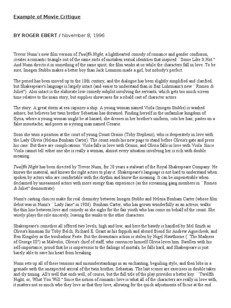 Trevor nunns new film version of twelfth night, a lighthearted comedy of romance and gender confusion, creates a romantic triangle out of the same sorts of mistaken sexual identities that inspired ``some like it ot! #nd nunn directs it in. A piece of paper that's been underwater for 84 years. What is an article critique? The movie that was directed by rajkumar hirami used a comedic and slice of life genre to portray the reality of what students of this day experience. Sample summary & critique papers these examples are reproduced from writing in biology. 003 evaluation essay on movie sample best photos example film critique review essays ~ thatsnotus these pictures of this page are about:movie critique paper example. For example, if you're critiquing a research article about a new treatment for the flu, a little research about other flu treatments currently available could be as another example, if you're writing about a movie, you might want to briefly discuss the director's other films, or other important movies in this. Critical approaches in writing a critique/reaction paper. Do not be a critic. Movie critiques can be easily confused with movie reviews. Aside from focusing on the plot elements. When you know how to write a movie critique paper, the whole process is nothing but fun. Generally, it is an objective analysis of any piece of work (not depending on its genre), which includes your personal thoughts on the subject.